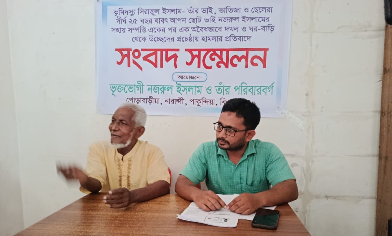 সংবাদ সম্মেলনে ভুক্তভোগী নজরুল ইসলাম ভূঁইয়া জানান, তাদের পৈত্রিক সম্পত্তি আনুষ্ঠানিকভাবে ভাগ-বাটোয়ারা হয়নি। ২৫ বছর ধরে গ্রামের পোড়াবাড়িয়া ও কর্শাকুড়িয়াল মৌজার ছয়টি দাগে তার ভাগের অন্তত এক একর ফসলি জমি চার ভাই মিলে জোরপূর্বক দখল করে ভোগ করছেন। আমার প্রাপ্য অংশ বুঝিয়ে দিচ্ছেন না তারা। সম্পত্তির ভাগ দাবি করলে তারা আমাদের অশালীন ভাষায় গালাগাল করে ও মারধর করতে উদ্যত হয়। পরে বাধ্য হয়ে ২০০০ সালে কিশোরগঞ্জ সহকারি জজ আদালতে বাটোয়ারা মামলা দায়ের করি। ২০২২ সালে আদালত মামলার রায় ও ডিক্রি আমার পক্ষে দেন। বিবাদীরা আদালতে রায়ের বিরুদ্ধে আপিল করেন। আদালত তাদের আপিল খারিজ করে দেন। এতে ক্ষিপ্ত হয়ে সিরাজুল ইসলাম ও তার ভাতিজারা আমাকে ও আমার ছেলেকে মারধর করে। পরে এলাকাবাসি এগিয়ে এসে আমাদের রক্ষা করে।